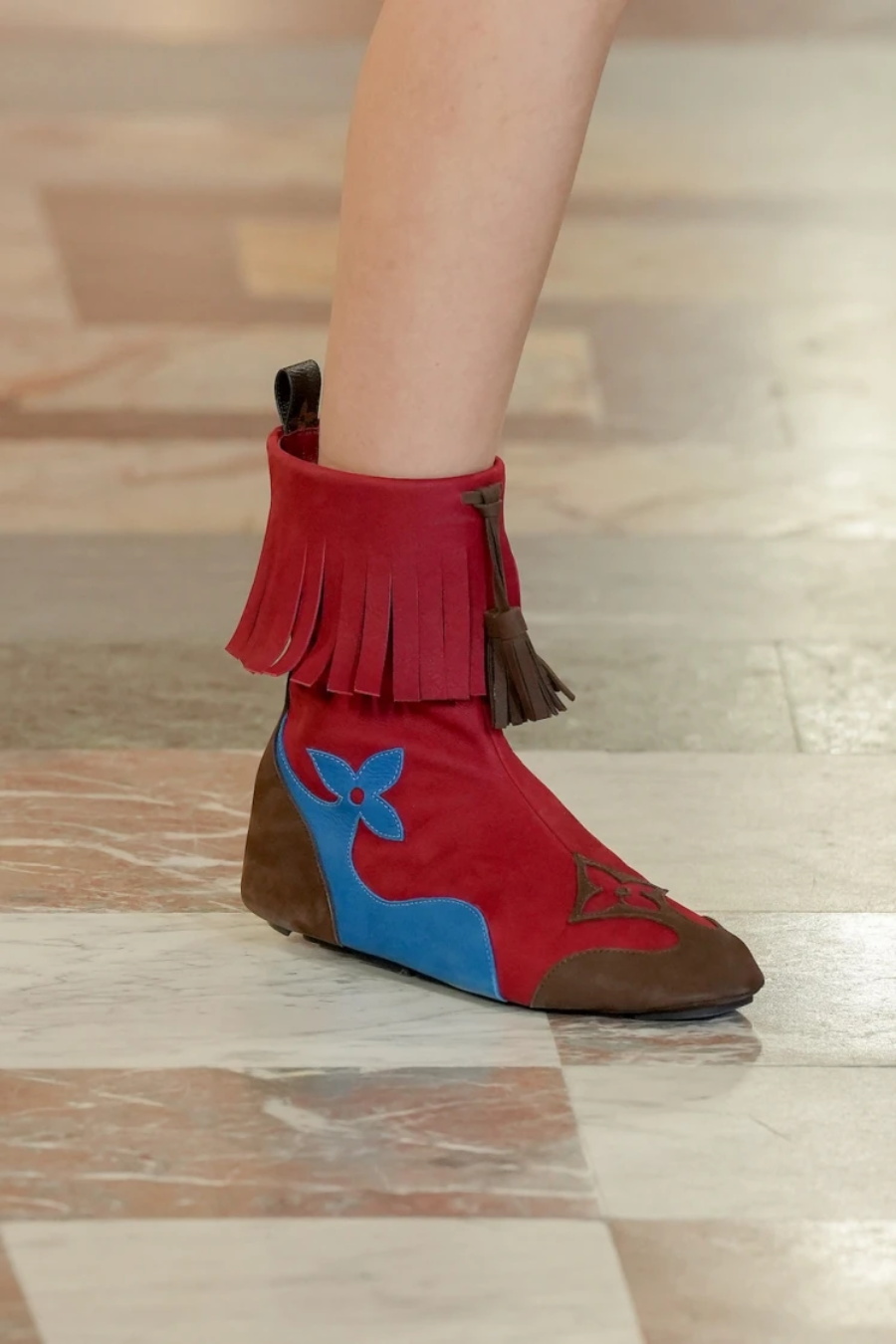鞋履系列突破传统:金色平底凉鞋融合芭蕾舞鞋轮廓,红色流苏短靴加入动物元素。