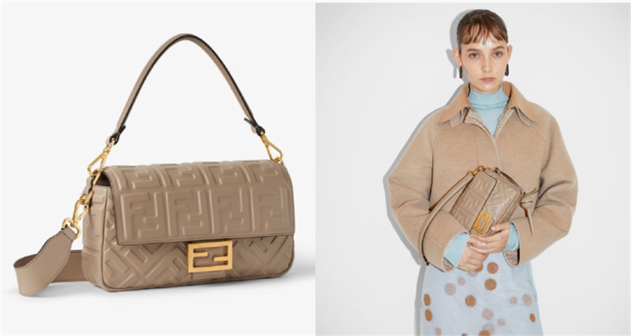 3. Fendi Baguette(约28,290元) 灵感来自法式长棍面包的腋下包型,搭配立体压花FF图案,柔软小牛皮材质赋予其多变背法。从手提、肩背到斜挎,轻松适应不同场合需求。