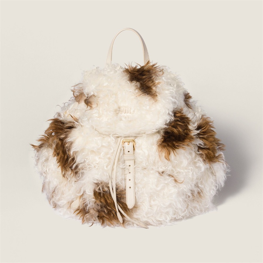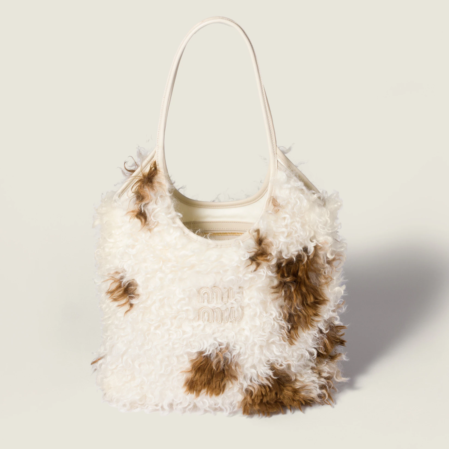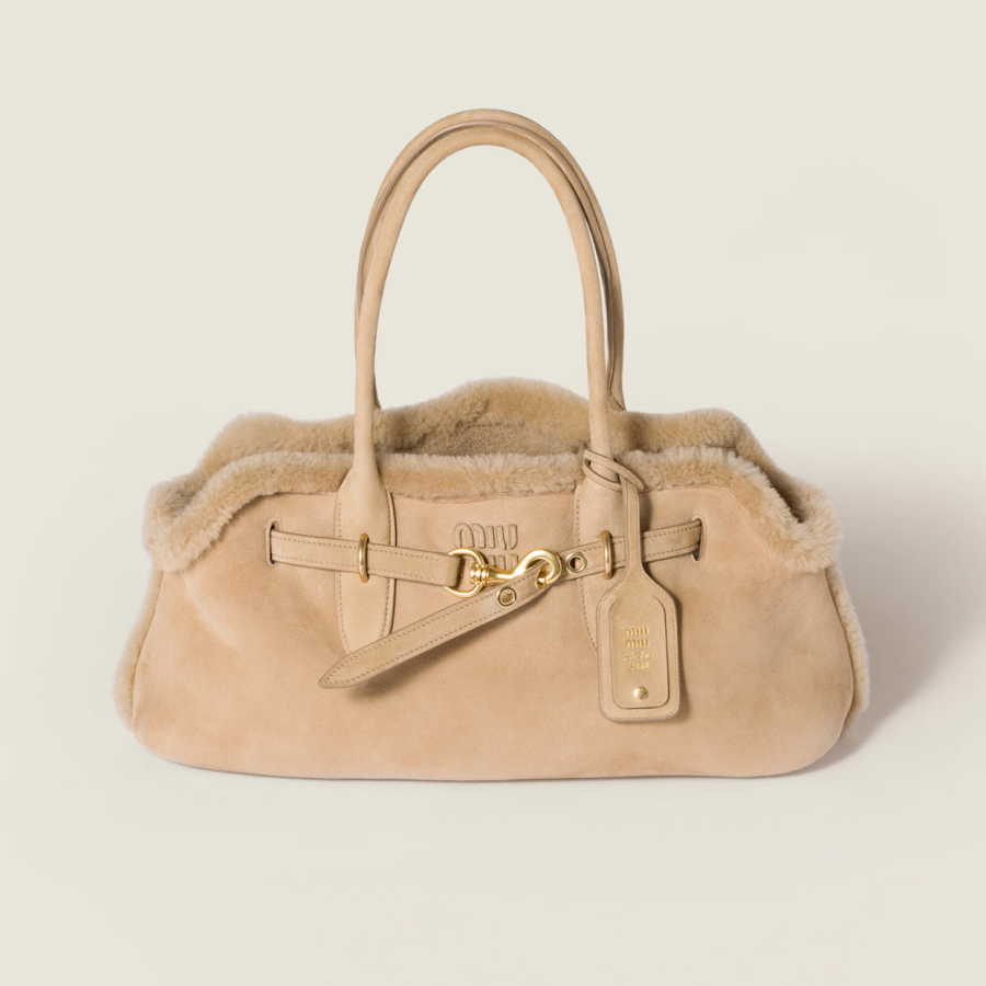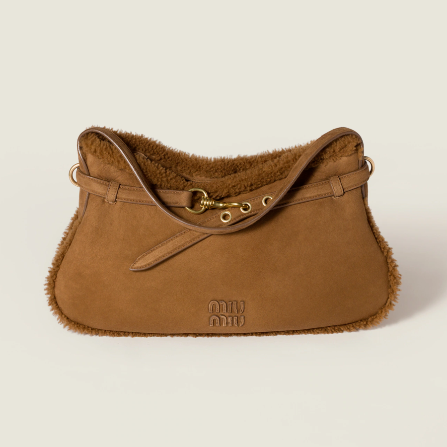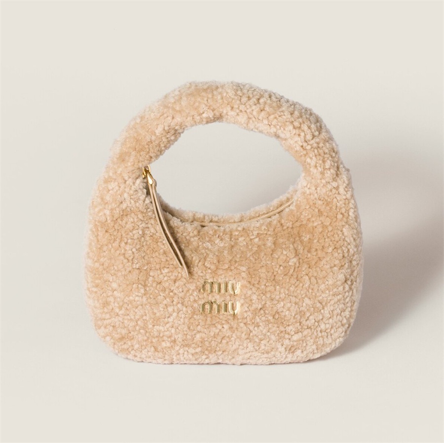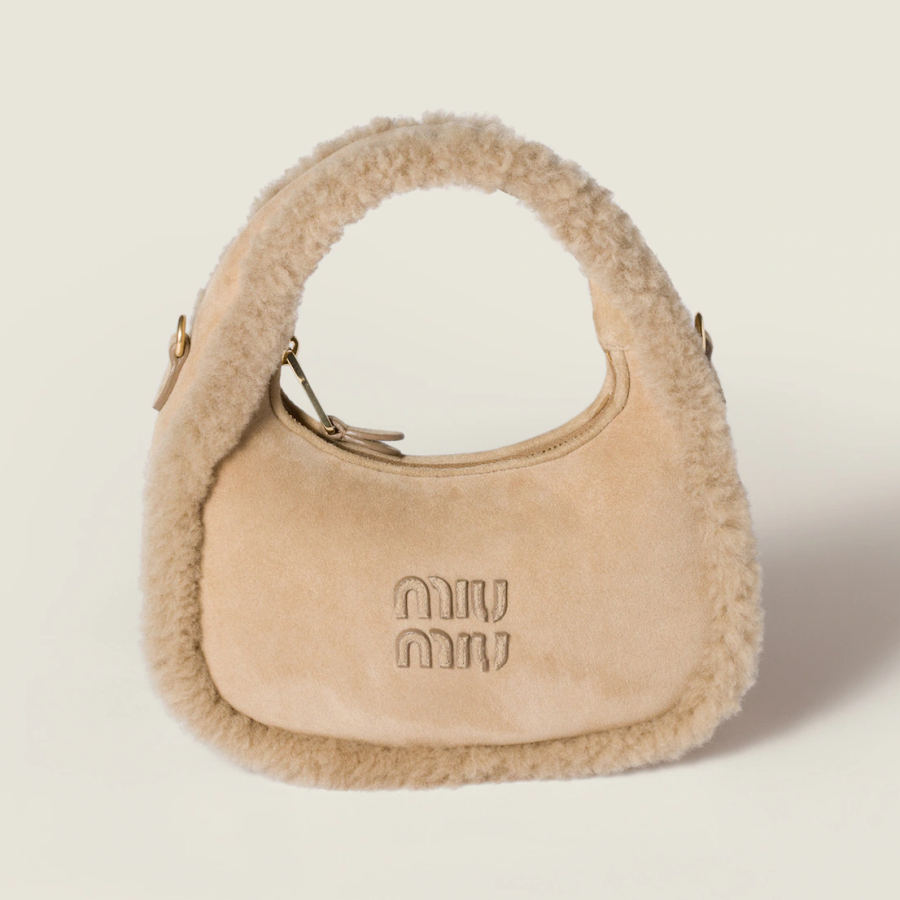 Miu Wander 弯月包披上沙黄色卷曲羊羔毛外衣,形似抱枕的圆润轮廓充满疗愈感。官价2,400欧元。