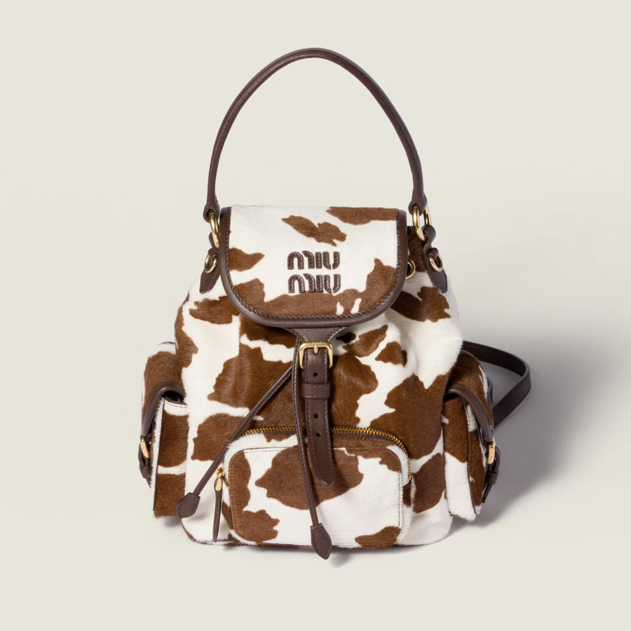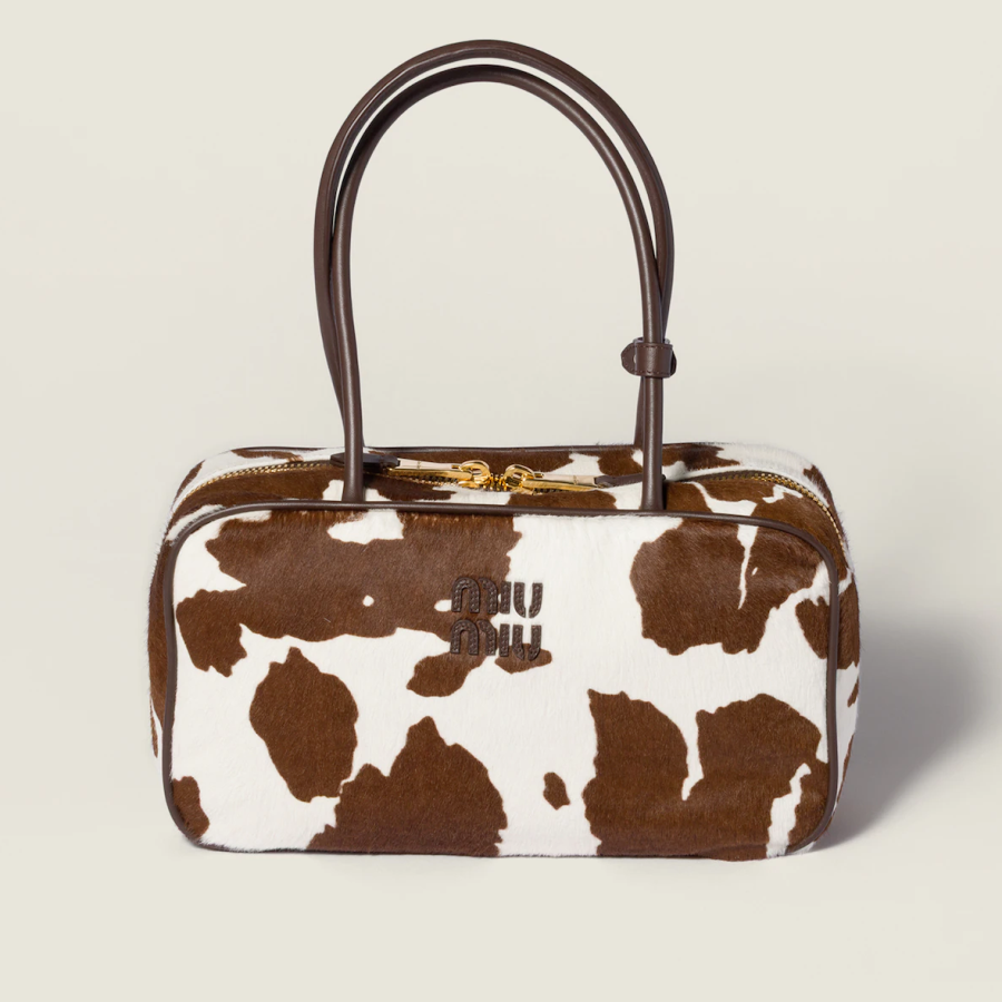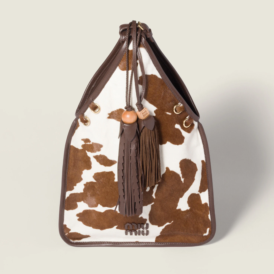 小牛毛材质搭配白棕相间的奶牛纹图案,短促细腻的鬃毛质感与活泼印花相得益彰。托特包额外装饰棕色皮革流苏,增添波西米亚风情。官价2,200欧元至3,200欧元。