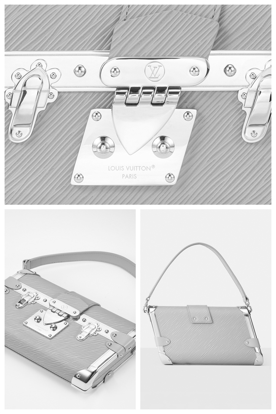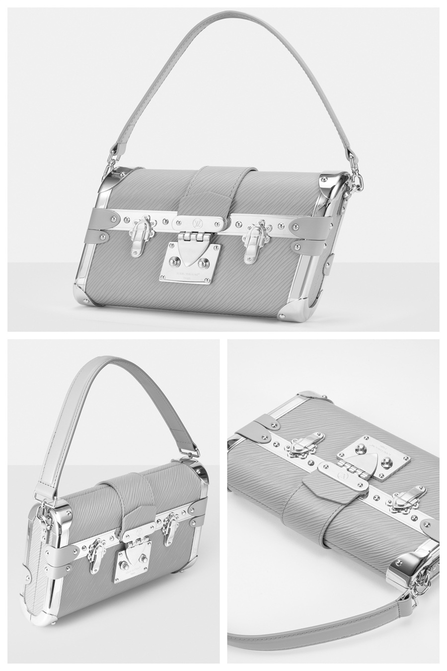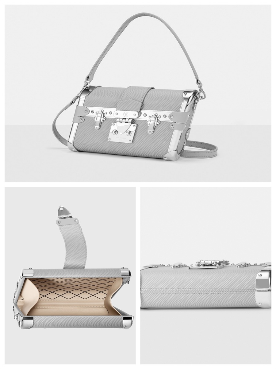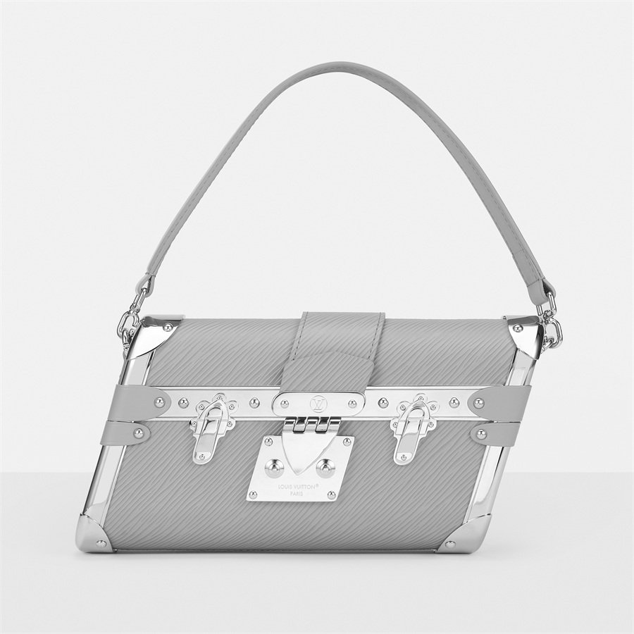 Petite Malle Blade 手袋出自 Louis Vuitton 2025秋冬女装秀场,包包以高速行驶中的列车为设计灵感,采用别出心裁的平行四边形结构重塑经典硬箱廓形,抛光闪亮的金属配件和银色皮革营造出前卫科幻的气息。