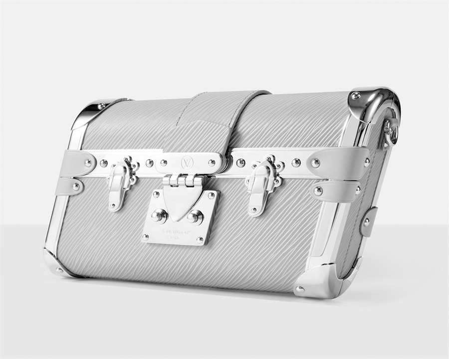 Petite Malle Blade 延续了路易威登经典硬箱的木质底座、金属锁扣和包角等标志性元素,原本用于加固箱体的榉木条被替换为更符合现代需求的银色金属材质,并镶嵌以蚀刻品牌徽标的银色圆铆钉。