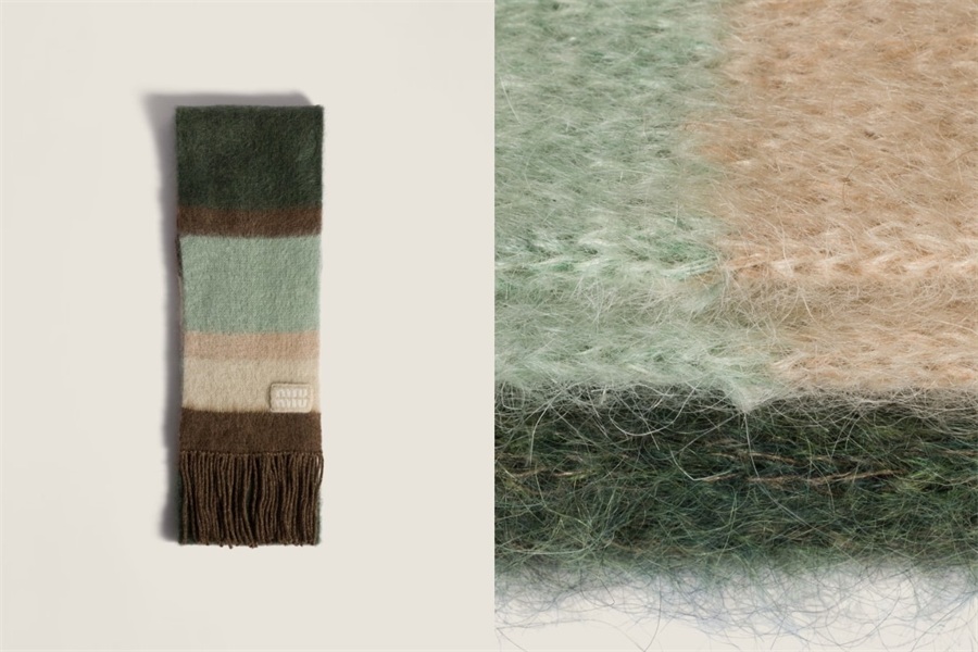 Miu Miu Wool Scarf With Fringes (HK$6,300) 流苏细节与细腻Logo织纹展现少女般的俏皮感,纯羊毛材质保暖而不显厚重,适合搭配短外套打造甜美造型。