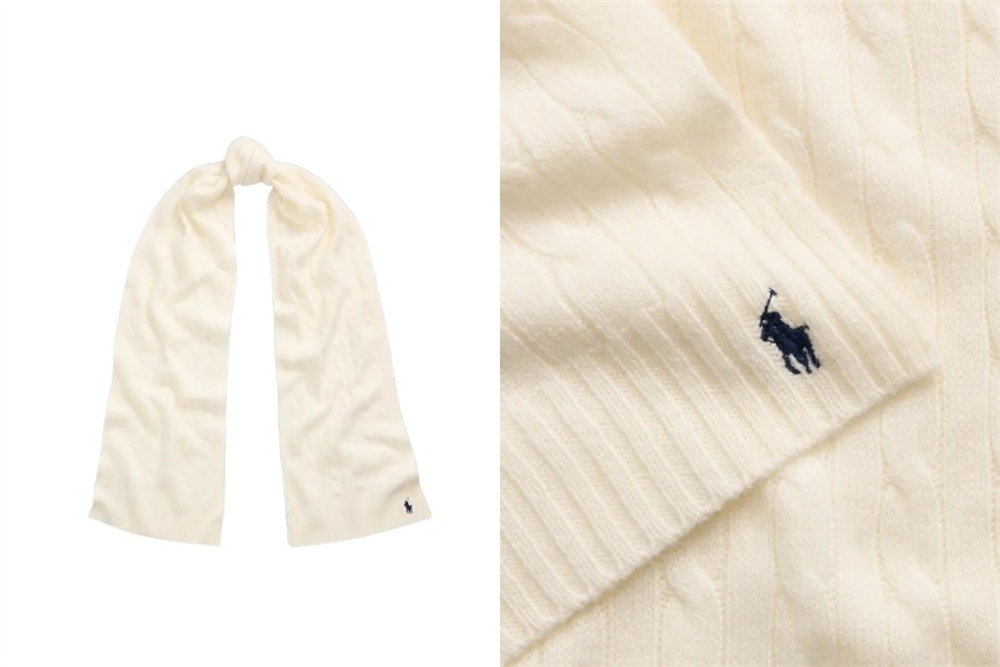 Polo Ralph Lauren Cable-Knit Scarf (HK$1,790) 经典麻花针织纹理演绎美式学院风,羊毛混纺羊绒材质在保暖与质感间取得完美平衡。
