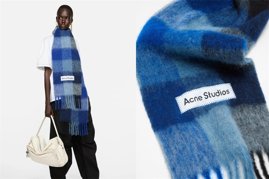 Acne Studios Mohair Checked Scarf (HK$2,800) 标志性格纹与马海毛材质碰撞出北欧艺术感,亮眼撞色设计成为整体造型的焦点。