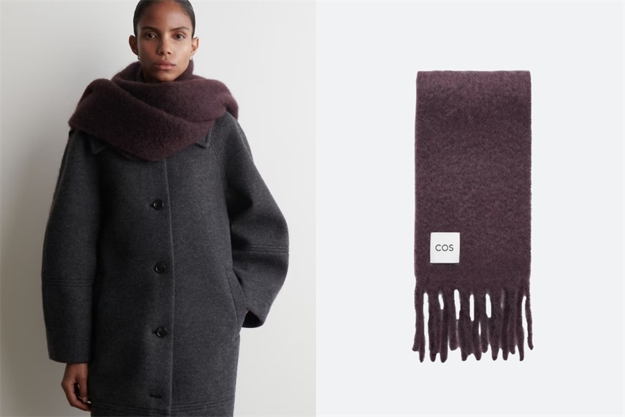 COS Fringed Brushed-Mohair Scarf (HK$890) 极简设计搭配马海毛柔和光泽,流苏细节提升层次感,是通勤日常的百搭之选。