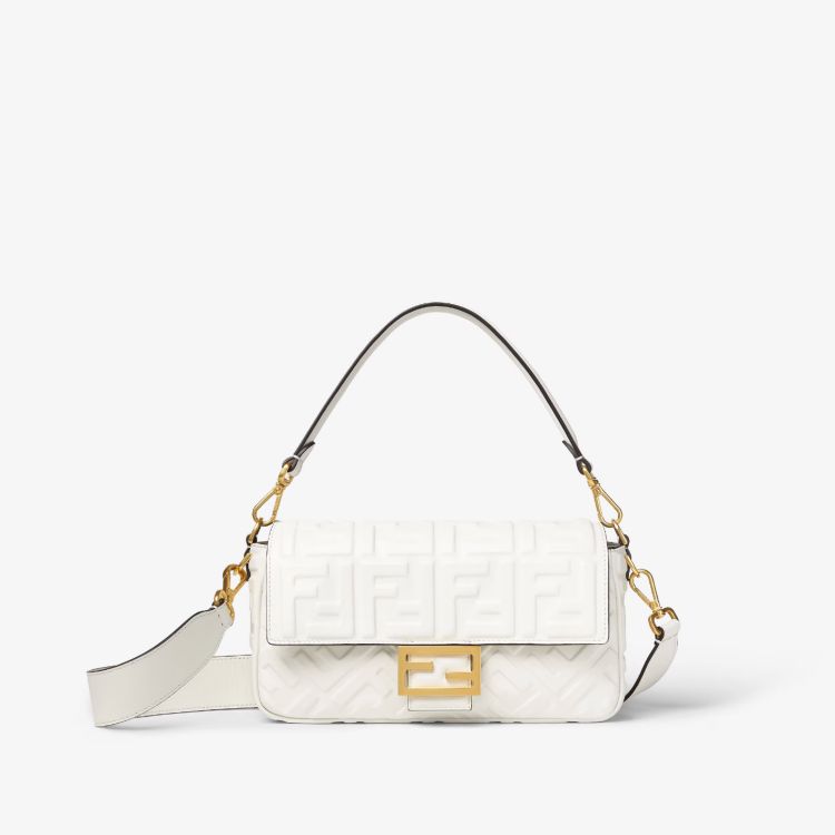 Fendi这款经典中型Baguette以「优雅、柔软、隽永」三个关键字完美浓缩包款魅力。1997年诞生后成为时尚史上第一个It Bag,此次以云舞白小牛皮打造,并透过立体压纹FF图案重塑经典。金色FF钩点缀包身,翻盖上还能看到低调压凹的Fendi字样,附上可拆卸短肩带与长背带,可腋下背、肩背或斜背,相当实用。参考价格:约人民币 29,520 元