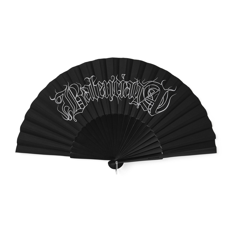 Amadeus 扇子:黑色木材扇骨,灰黑色棉质扇面,印有Balenciaga徽标,呈现哥特风格。