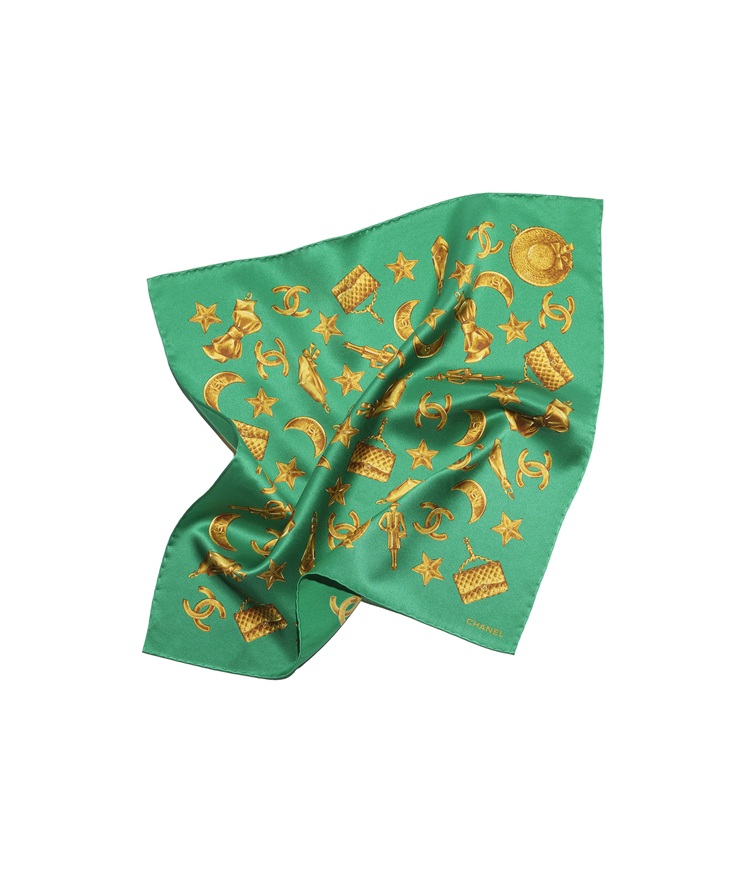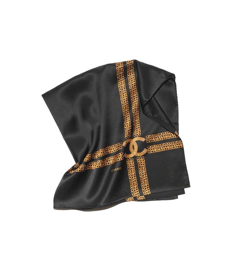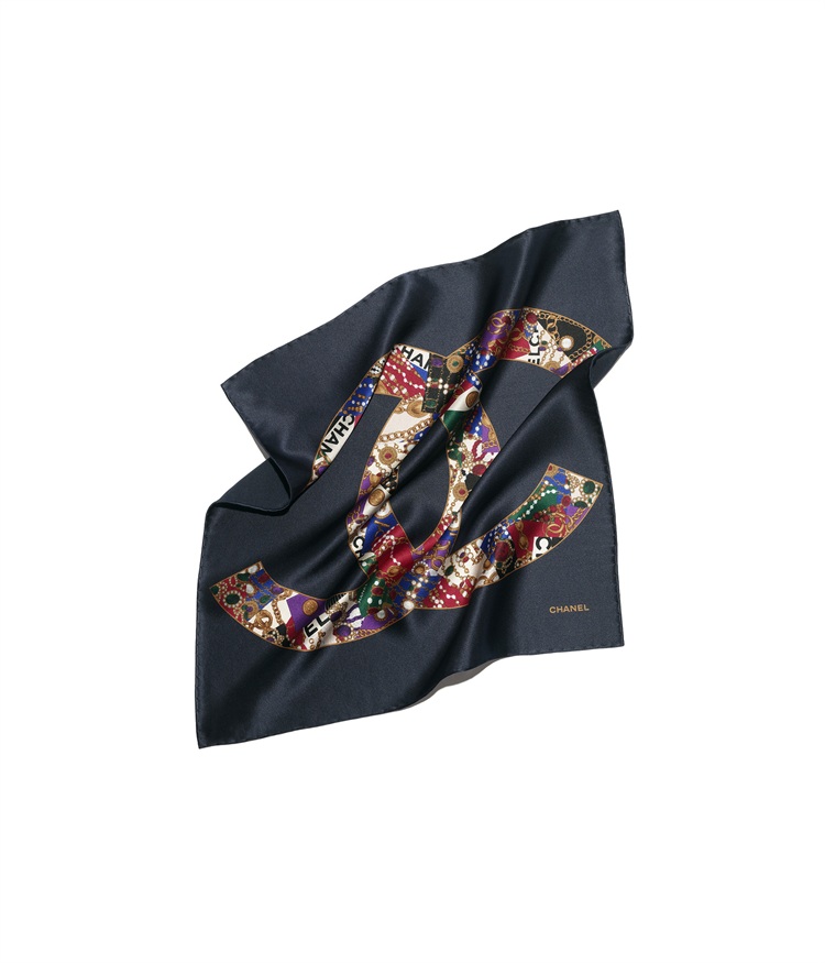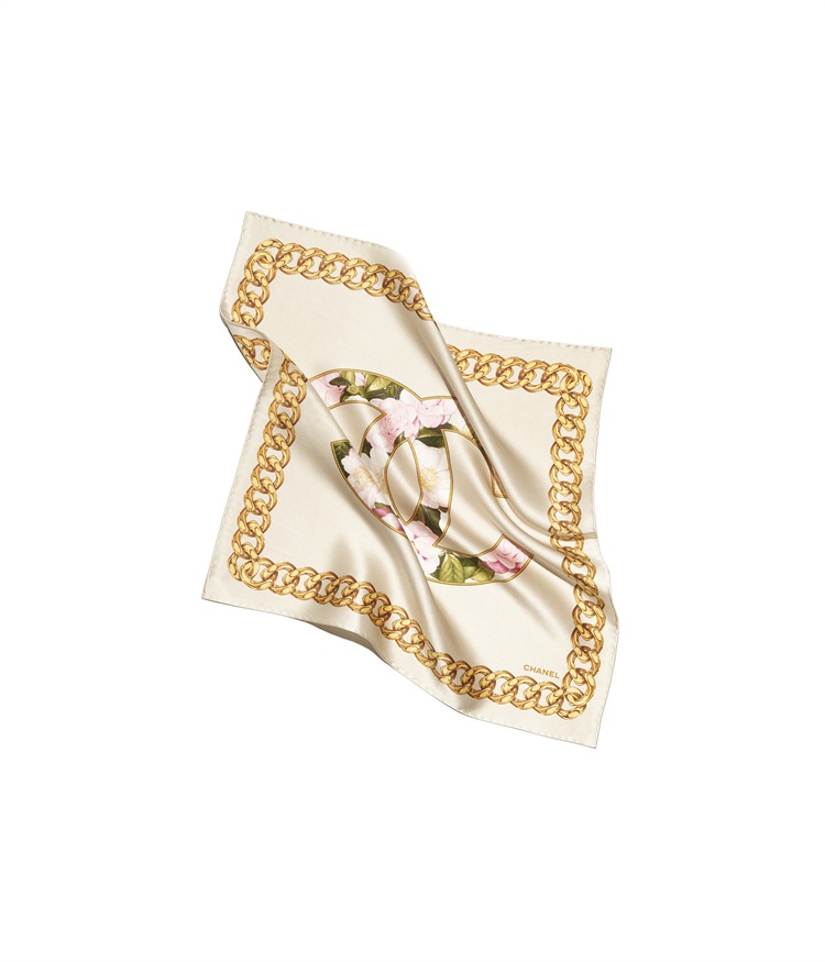 系列中也带来多款印花丝巾,展现CHANEL 丰富的视觉叙事,图案也精心融合了品牌标志性的双C Logo、山茶花、链条与华丽图腾,而丝滑的缎面材质也赋予了造型轻盈感,除了系在颈间外,也很适合绑在包款上当装饰。