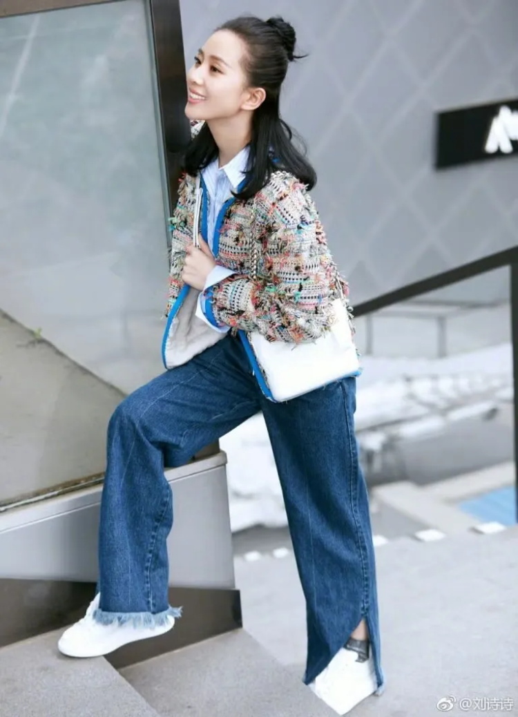 刘诗诗以小型GABRIELLE Hobo 搭配CHANEL 经典斜纹软呢外套,绑上丸子头与宽版牛仔裤,优雅又带休闲感,这套造型也被粉丝列为「诗诗最亲民又最好学的穿搭」。