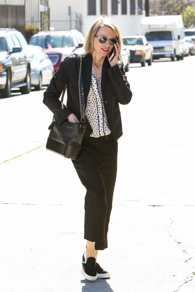好莱坞影后Naomi Watts 以简约黑白穿搭搭配全黑羊皮Hobo 包,一个墨镜就让整体气场更加分,完美示范what is effortless chic。