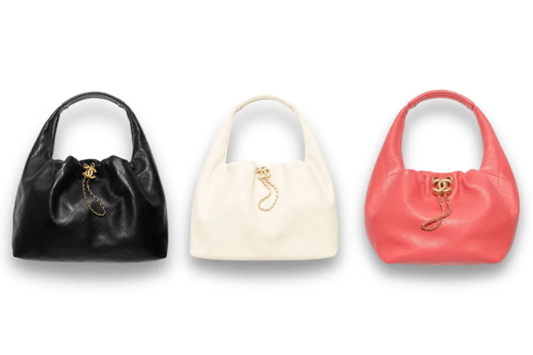 Chanel 2025/26 早春度假系列中的一款流浪包(Hobo Handbag)采用柔软的轮廓设计,搭配经典的菱格纹缝线和标志性的金色双C标志,兼具优雅与休闲风格。