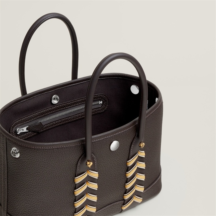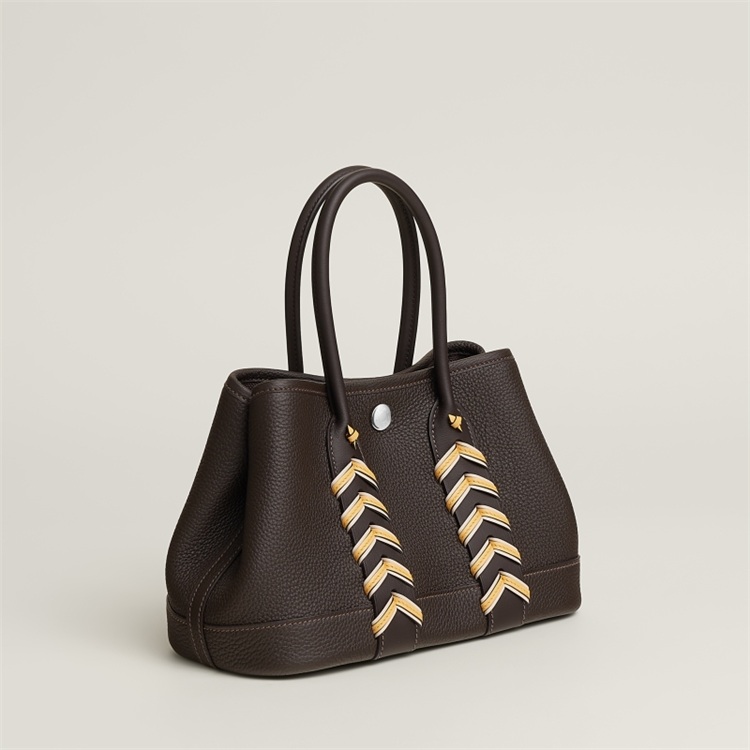 顾名思义,“Bredies”点出了这款新包最大的设计巧思——编织。打破了以往 Garden Party 系列极致简约的印象,新作在提把衔接处注入了精致的双色皮革编织细节。工匠利用两种不同宽度的皮革织带进行重叠与缠绕,创造出层次分明且吸睛的视觉效果。这不仅是一个装饰细节,更是爱马仕精湛制作工艺的又一次炫技。