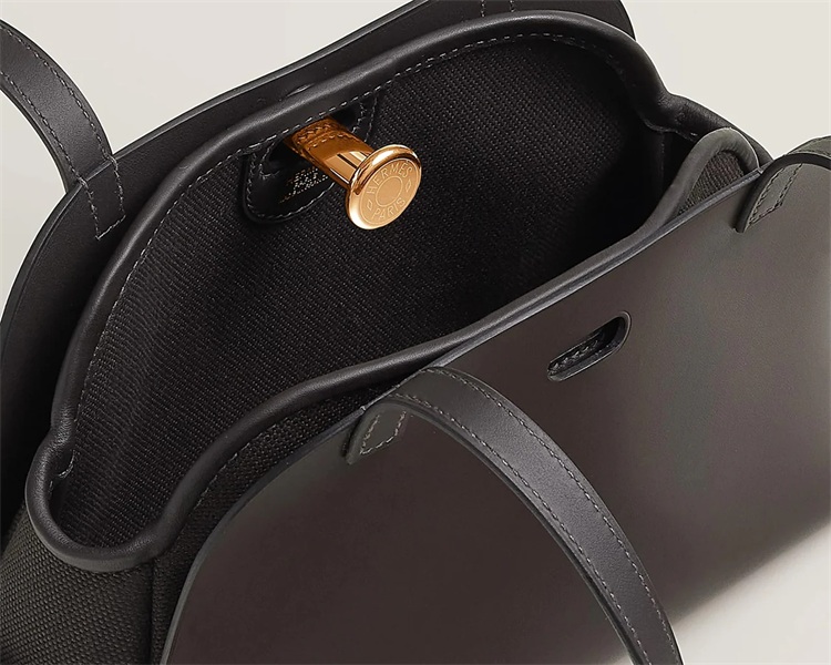 材质方面, Hunter 牛皮外层如同一个坚固的保护壳,包裹着内部可拆卸的帆布袋。这种内外分层的结构,恰恰映射了马鞍工匠严谨有序的工作流程。与常见的拉链不同, Tablier Sellier 采用了一枚向上开启的 Clou de Selle 鞍钉作为闭合装置。它能以近 90 度的角度滑过专属的皮革切口,像一枚精致的袖扣般,利落而整洁地完成开合。