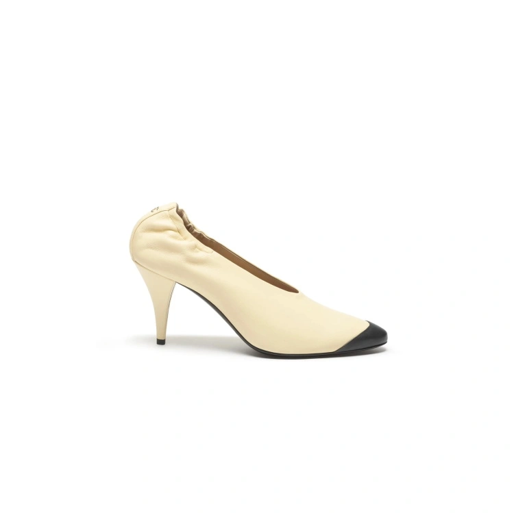 Matthieu Blazy 打破了双色鞋的传统刻板印象,赋予其更为摩登且复古的全新形态。在这款沙色跟鞋中,他巧妙地利用漆皮与麂皮两种截然不同的材质制造反差,将经典的双色元素抽象为洗练的线条。这种设计在保持外观简洁的同时,赋予了鞋履丰富的视觉层次感。