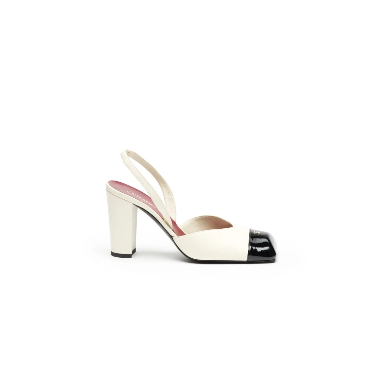 这款粗跟鞋或许是最接近我们记忆中经典双色鞋的款式。设计师通过方头楦型的运用,营造出浓郁的复古氛围。亮面皮革的光泽感与金属双 C Logo 的点缀相得益彰,为整体造型注入了一丝不张扬的奢华气息。