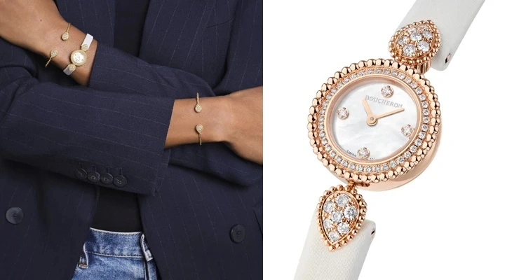 Boucheron 的 Serpent Bohème 模糊了腕表与高级手镯的界限。两颗标志性的水滴形镶钻坠饰依附于表壳,随佩戴者动作轻微摇曳,犹如腕间的一件微型雕塑。玫瑰金滚珠边框与珍珠母贝表盘的融合,散发出内敛而高贵的光晕,是极简穿搭中最绝妙的点睛之笔。(参考价格:约人民币 106,700 元)