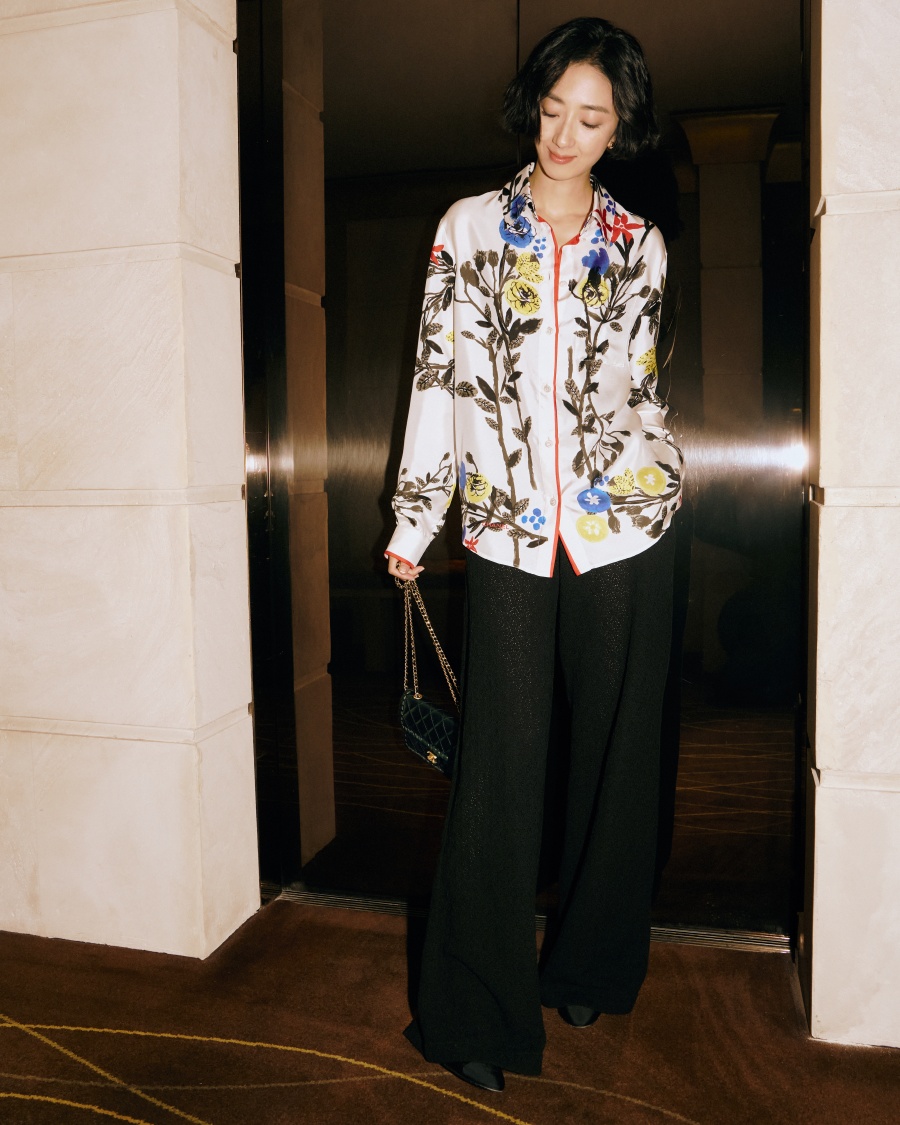 身为品牌大使的桂纶镁,以印花丝质衬衫搭配黑色阔腿裤,展现优雅与休闲的平衡。她选择的黑色菱格辫饰口盖包线条简约,细节却不失亮点,可完美融入各种穿搭风格。