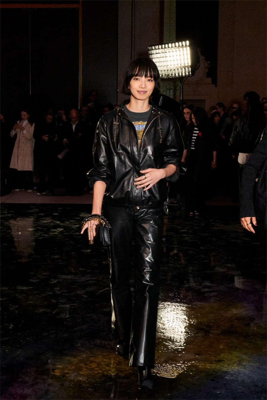 周迅以极简洋装亮相,配黑墨镜与尖头鞋,巨星气场全开。她手拎漆皮大衣,与包袋面料呼应,造型完整度极高。