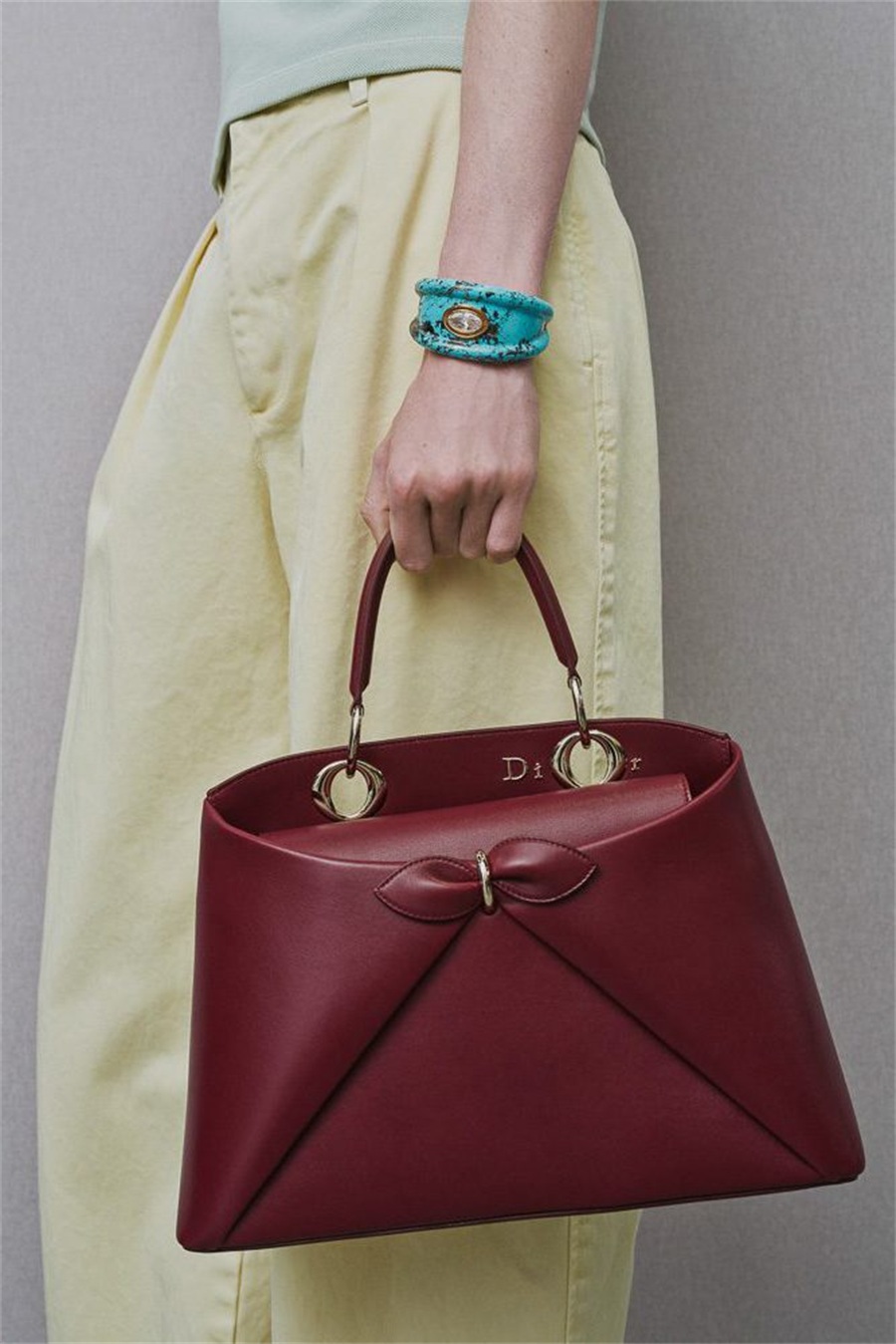 前Loewe创意总监 Jonathan Anderson 的Dior首秀成为时尚圈焦点。他将Y2K牛仔风与女性优雅融合,推出一款 蝴蝶结手提包:以手柄铆钉构成“D-I-O-R”字样,细节精致,充满新意。这款包被视为Dior下一个潜力新经典。
