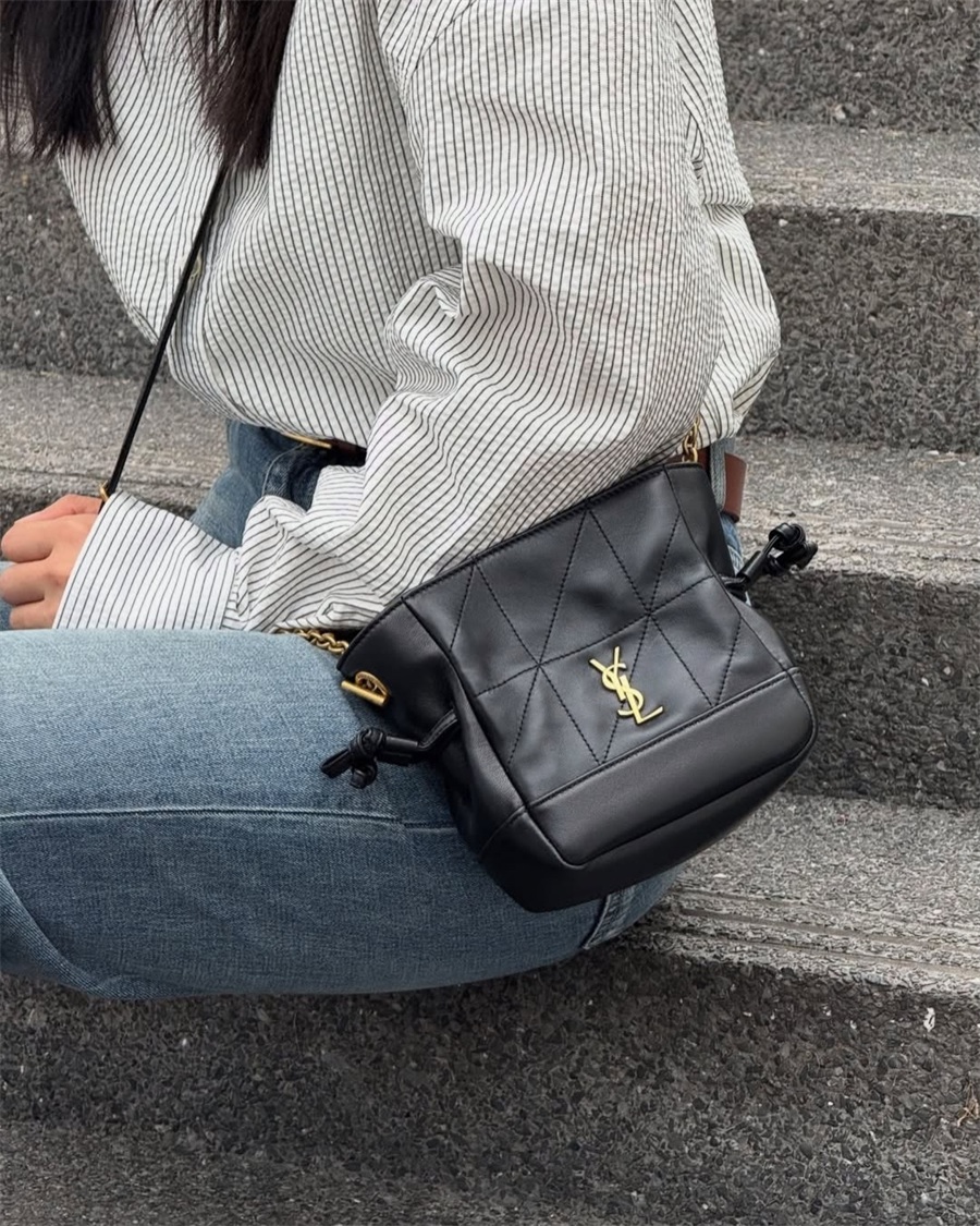 这只YSL的包真的太会了!你没法简单地叫它单肩包还是水桶包,这种“跨界”设计简直天才。材质是那种一摸就上瘾的软糯小羊皮,但整体廓形却被精致的方格纹撑得非常帅气,妥妥的“柔中带刚”。最绝的是那个金色的YSL Logo,往那一放,整个包的贵气瞬间拉满,圣罗兰的气场永远值得信赖!