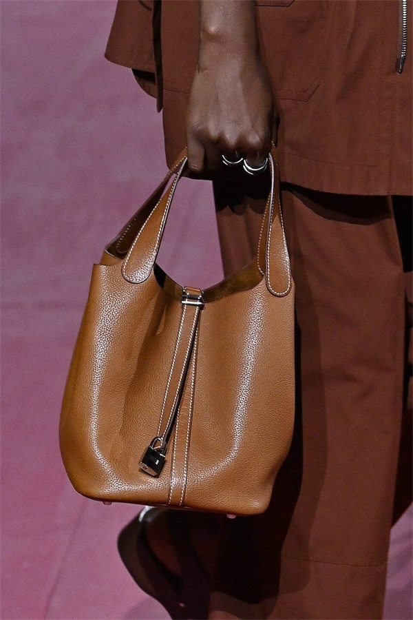 一般人认识爱马仕的 Picotin Bag,大多是18、22两款偏细小的尺寸,但其实系列还有较大的26,属于大容量尺寸。在品牌2025年春夏的时装秀上,我们看到一款全新的大尺寸 Picotin Bag,以经典焦糖色皮革为外形,再配上白色车线,整个手袋充满低调奢华的气质,相信会让不少品牌粉丝重新爱上。