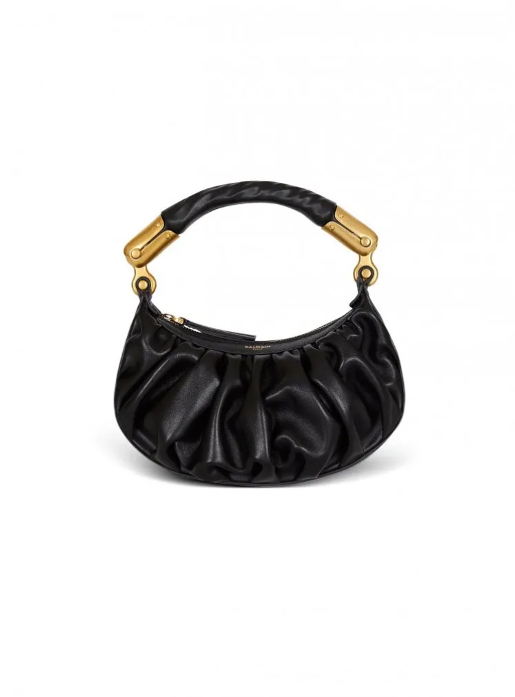 Balmain 全新 Ebene Mini Bag 同样以圆润的饺子形为主调。柔软皮革形成的自然褶皱丰富了视觉层次,而金属手柄的加入则为小巧的包身增添了奢华的贵气与亮点,是晚宴或约会的点睛之笔。