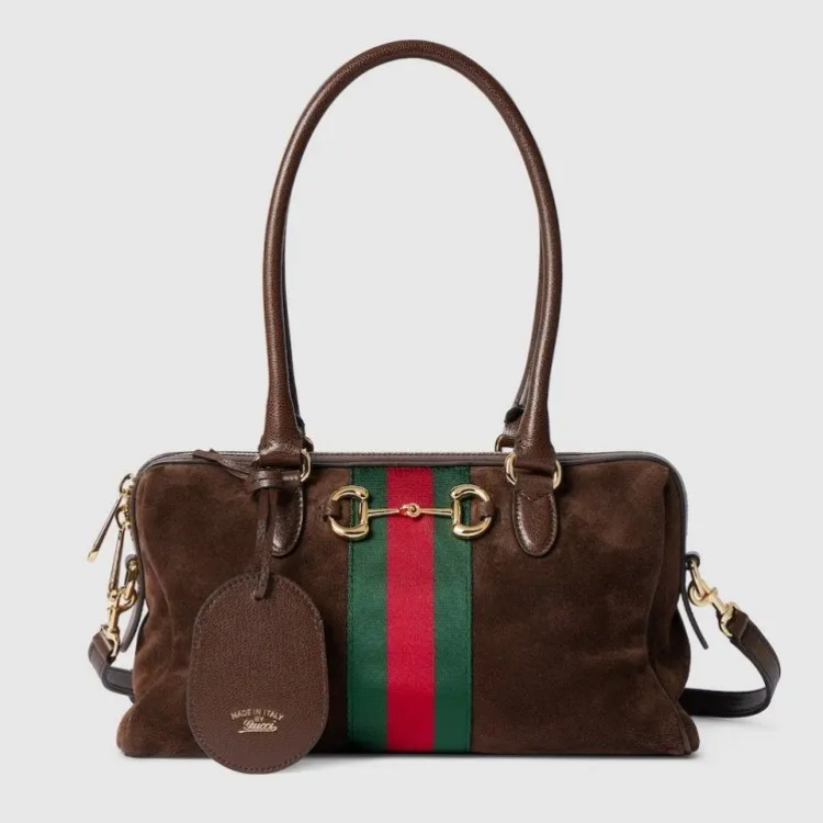 来自 Gucci 2026 春夏系列的 Borsetto 包款,再次将马衔扣推向视觉中心。这款波士顿包拥有复古的外形,绒面材质赋予其满满的高级质感。长手柄取代了传统的短手柄,不仅丰富了佩戴方式,更为设计注入了几分大气从容,令人一见倾心。