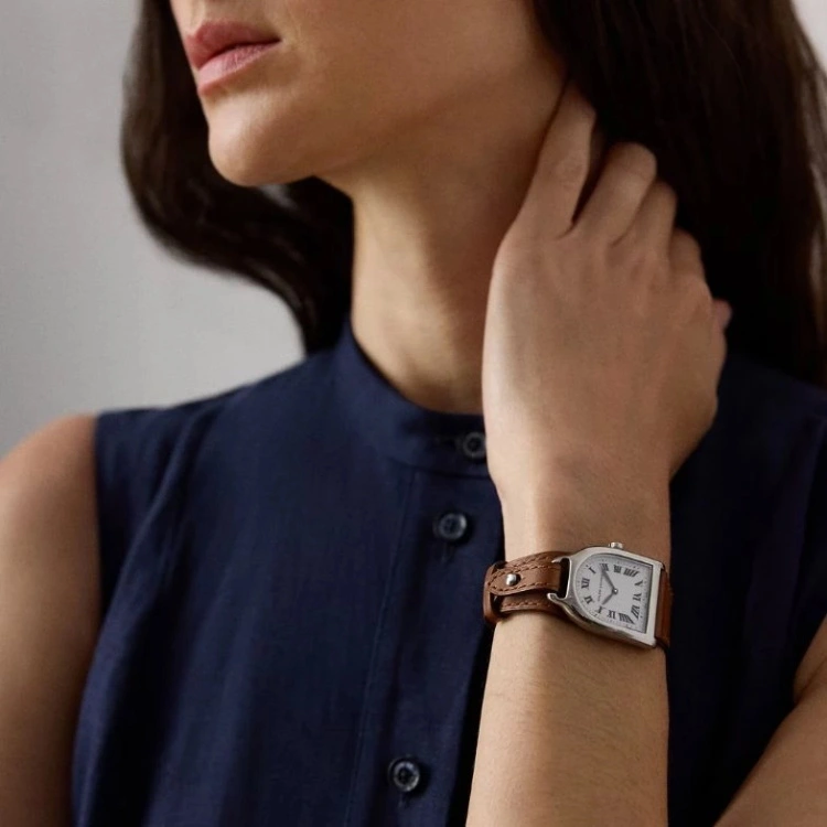 马镫造型表壳是该系列最迷人的标识。弧形外框融入马术元素,让腕表比一般圆表或方表多了一层故事感。表盘配置简洁,搭配罗马数字或细长指针,视觉焦点始终汇聚在那极具辨识度的表壳之上。皮带款式尤其出众,当表壳落在手腕侧边,宛如一件经过精心推敲的配饰;与驼色外套、白裤及骑士靴搭配,自然流露出上流生活的闲适品味。