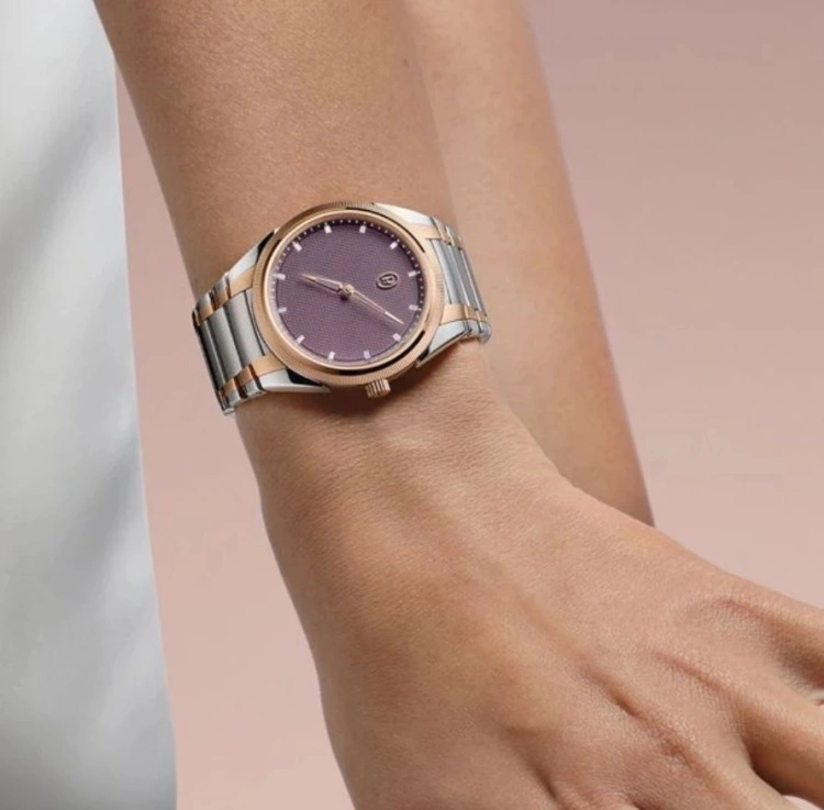 36毫米精钢表壳搭配一体式链带,厚度仅8.6毫米,比例极度利落。铂金滚花表圈是该系列最具代表性的细节,面盘饰以 Grain d’Orge(大麦粒)手工机刻纹,细密纹理在光线下层层铺展,精致而安静。链节收束流畅,面盘无冗余装饰,与白衬衫、灰色长裤、羊绒针织搭配时,分寸拿捏极佳。