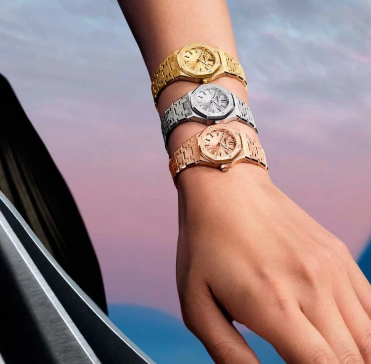 23毫米的极小尺寸,将皇家橡树最经典的八角形表圈与一体式链带,收纳进更接近珠宝表的比例中。霜金(Frosted Gold)工艺覆盖于表壳与链带表面,细致颗粒让贵金属呈现出柔亮光泽。经典的“Tapisserie”格纹面盘与立体时标保留了皇家橡树原有的结构感,缩小尺寸后更显精巧,搭配黑色洋装与利落短外套,尤为出色。