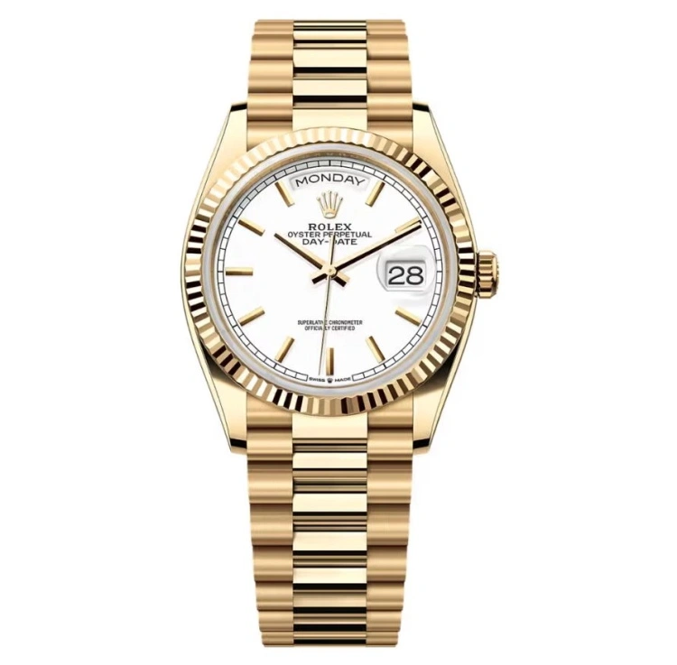 36毫米表壳配上三角坑纹外圈与元首型(President)表链,是劳力士最具代表性的正装腕表之一。Day-Date 系列仅采用贵金属(黄金、永恒玫瑰金或白金)材质,每种材质都承载着不同的气质。星期与日期视窗让面盘布局平衡完美;香槟金、白色或绿色面盘则能与表壳形成微妙的色彩呼应。这枚腕表的分量感,不在于张扬,而在于其将贵金属的光泽、链带的服帖度以及经典设计的成熟美感完美融合。